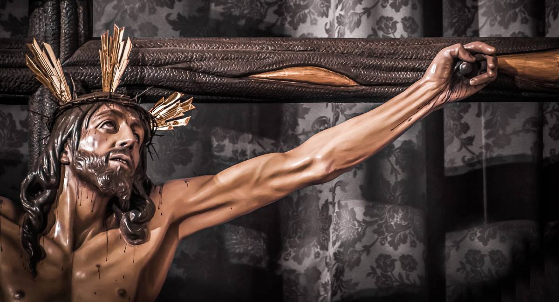 Jesús de mirada desgarradora por su expresividad y su ternura en el momento de aceptar su injusta y cruel ejecución. Costillas que se tensan ante la falta de aire y ojos serenos que se clavan en el cielo transmitiendo a la vez dolor y perdón, súplica y agonía, vida y muerte.